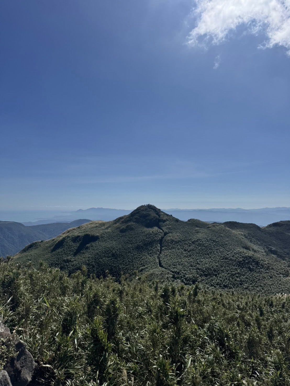 我們走出來的地方正是上七星山前的巨石,這個時候距離10:00的會師還有幾分鐘,我坐在巨石上納涼。我沒有走石階,卻在人煙罕至的箭竹林穿梭,沒想到上了山頂,柳暗花明又一村,七星山正在眼前。