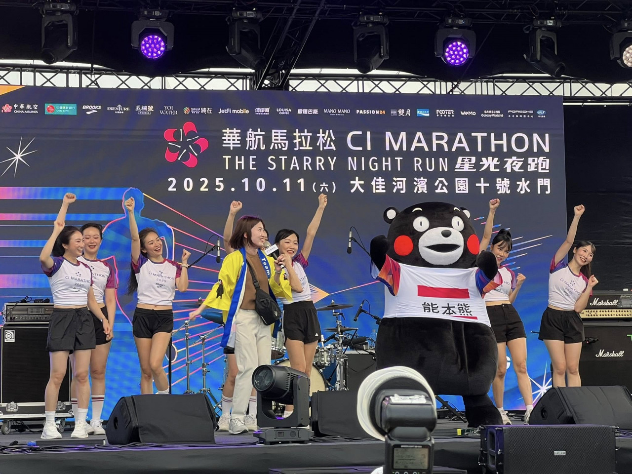 一直以來,我只參加大清晨起跑的馬拉松,晚上通常是休息時間,晚上我從來不跑步,這次是來感受華航辦馬拉松的快樂元素。起跑前的場子已經很熱,特別是抽機票的摸彩箱,連熊本熊也來了。