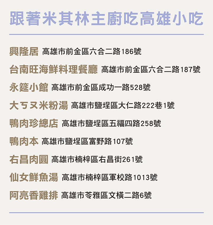 三位主廚共同的口袋名單,是六合二路的「興隆居」湯包。這家飄香數十年的老字號,不僅是簡天才的心頭好,也是蔡中和的早餐首選。皮薄、內餡肉汁鮮美,咬下一口就是滿滿幸福。從土魠魚粥、鴨肉飯到夜市雞翅,串起高雄市民日常,為旅人構築這座城市最動人的味覺地圖,按圖索驥也能唇齒留香。