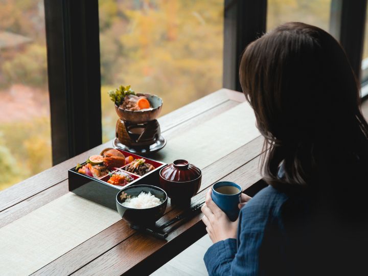 冬季晨光中,以谷關靜謐山林為景在客房中享用早餐,喚醒身體的精神與活力。選用當季食材製作的料理展現自然純粹的滋味,盛裝於極致華麗的蒔繪漆器盒中,食與器精緻地搭配呈現出細膩光澤、色彩與線條,象徵傳統工藝與現代料理的融合。伴隨著晨霧緩緩升起的山巒,專注地感受味蕾與心靈的洗滌。