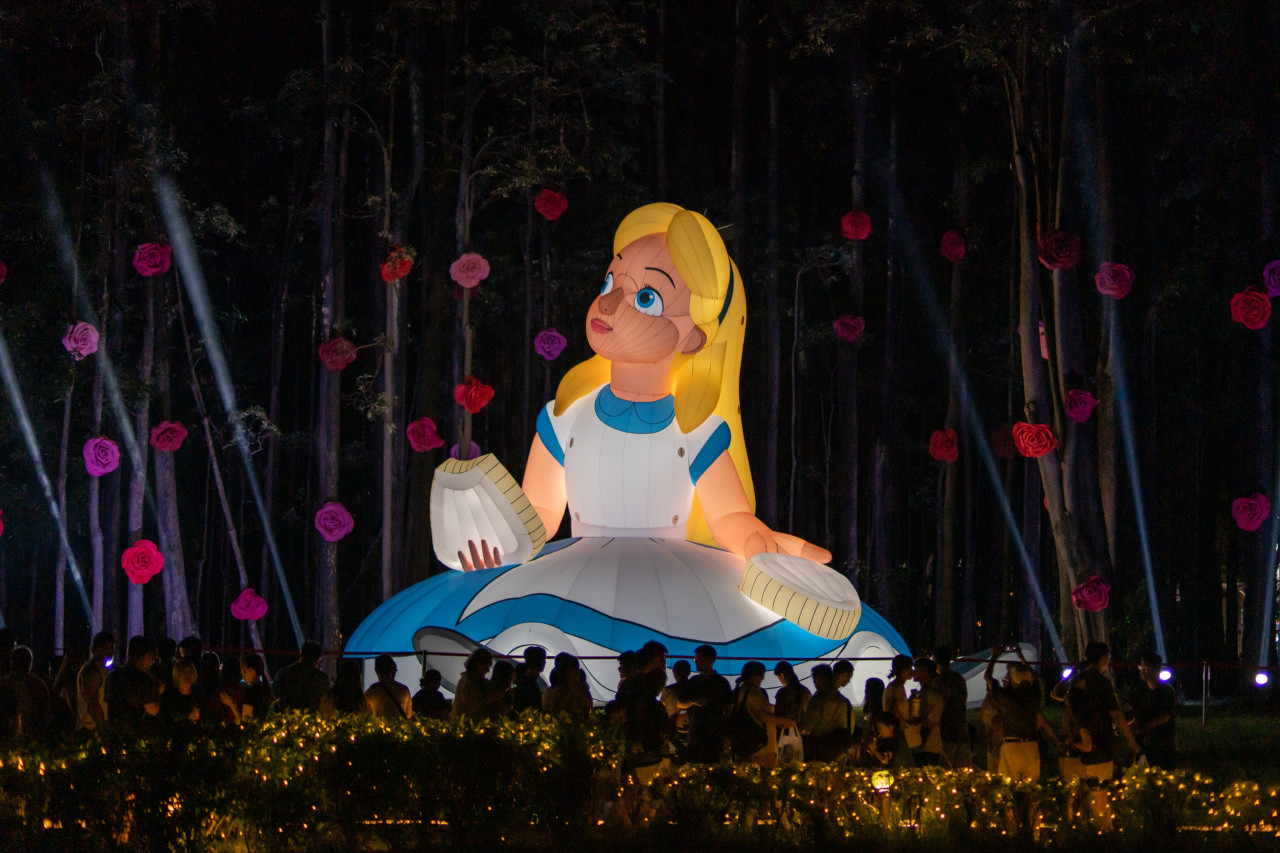 今年光織影舞以迪士尼經典動畫《愛麗絲夢遊仙境》為主題,展區設計兼具白天與夜晚之美。白天陽光灑落湖畔,巨型愛麗絲氣偶倒映水中,湖光與藍天構成夢幻景致。遊客近距離欣賞裝置藝術的細節與巧思,與巨型角色、奇幻花園及造型燈飾合照,感受童話場景的比例與驚喜;入夜後燈光亮起,整座北香湖化身為光影樂園,從30米沉浸光環隧道、9米高愛麗絲主題裝置,到湖面閃耀的「光月疊影」,每一幕都令人驚嘆。