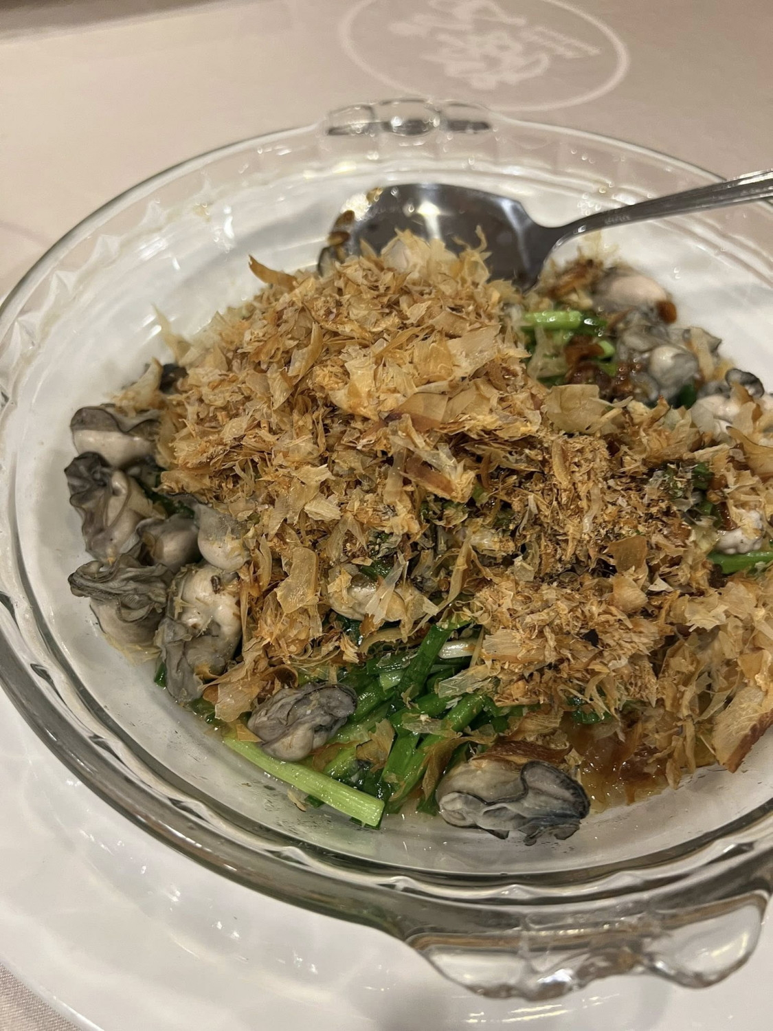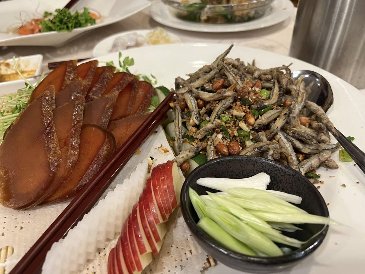 這回他蒸一條大的午仔魚,配清蒸活蝦、川燙活軟絲、清炒海菜⋯⋯這幾道菜很有海園的味道。李老闆特別提供一道台中港野生烏魚子及澎湖丁香魚,他特別強調這是他們家的野生丁香,口感一定跟別人不一樣。