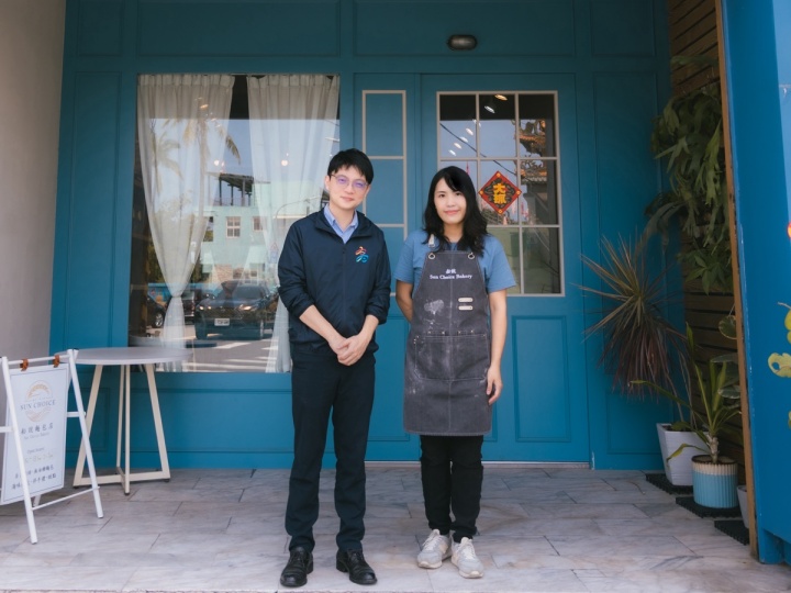 獲高雄市青年局「雄挺利」計畫支持,船說Sun Choice Bakery創辦人林惠勤(右)以在地食材研發創意烘焙,打造高雄特色伴手禮。左為青年局局長林楷軒。(圖為船說 Sun Choice Bakery提供)