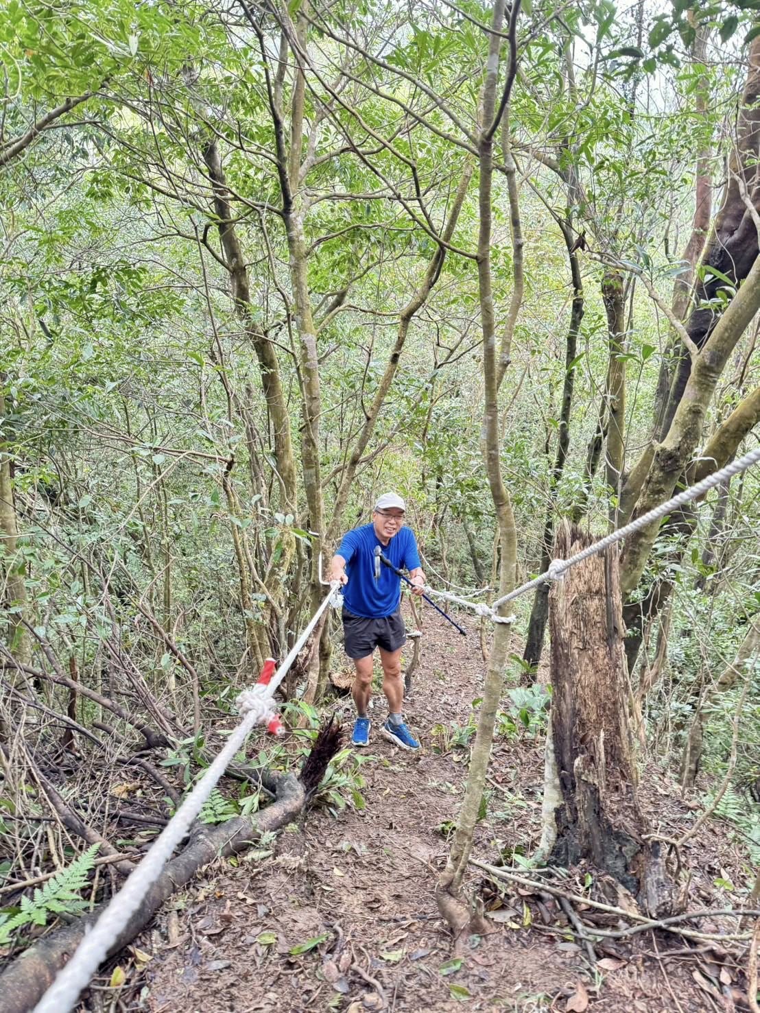 到了海拔463公尺的山頂,阿斌指著對面尖尖的山說是中坑東山,我說下去再上來要多久?他說兩個小時!我說下禮拜再來!這個時候是充滿挑戰的下坡路,原來這個山也是尖的。聯合艦隊兩側拉繩子,而且這個繩子是新的!阿斌帶我們來,原來他有情報知道這條路線才剛剛修整完成。
