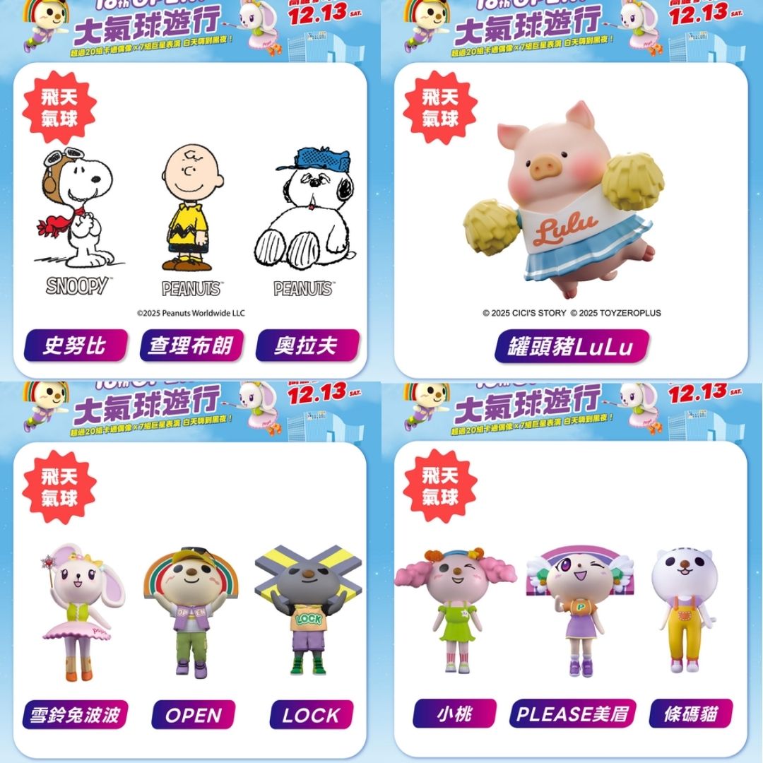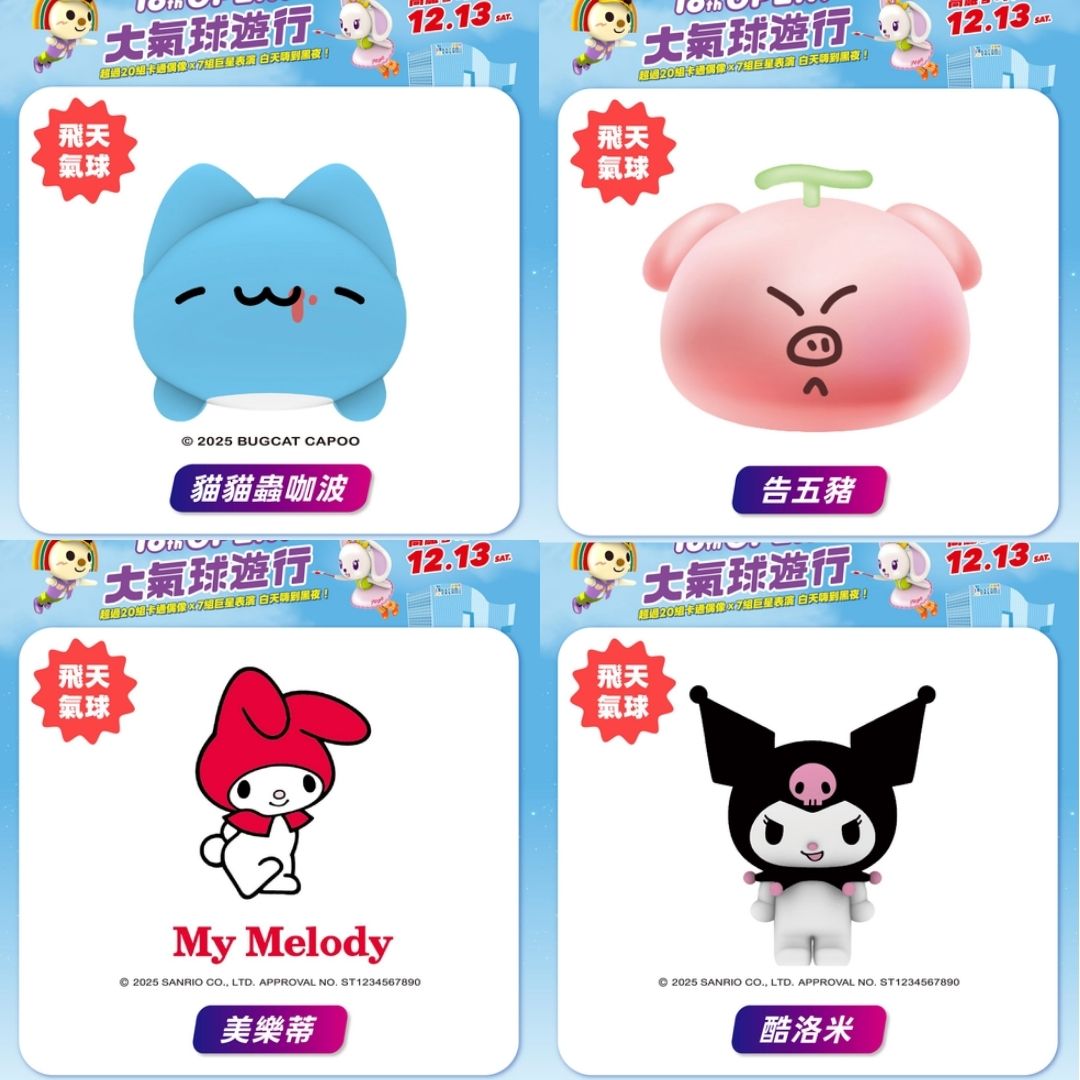 OPEN!大氣球遊行活動於12/13登場!集結OPEN!家族成員及酷洛米、美樂蒂、卡娜赫拉的小動物、貓貓蟲咖波等21組飛天大氣球遊行卡司,更邀請人氣天團告五人、啦啦隊女神李雅英、小朋友們最愛的救援小英雄波力等卡司一同參與一年一度的OPEN!大氣球遊行活動。