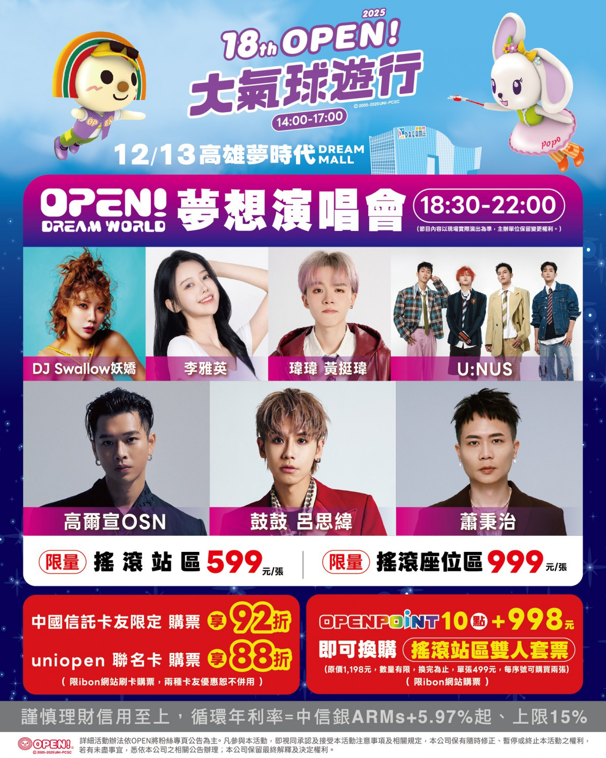 OPEN!大氣球遊行結束後,首次於晚間舉辦演唱會活動。OPEN!DREAM WORLD 夢想演唱會將於18:30在高雄夢時代前廣場舉行,邀請鼓鼓呂思緯、蕭秉治、高爾宣、U:NUS、李雅英、瑋瑋 黃挺瑋、DJ Swallow 妖嬌輪番登台演出,嗨翻高雄夢時代。