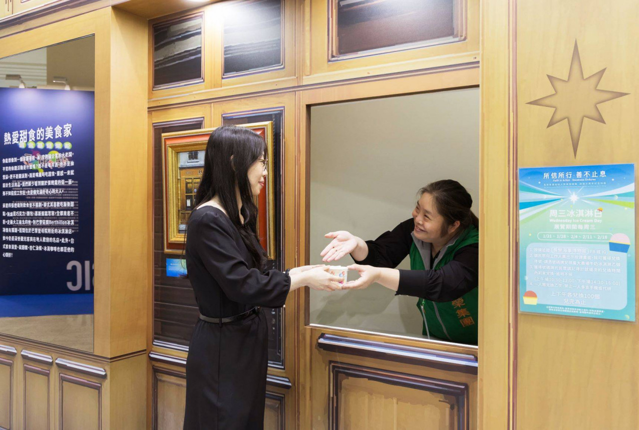 紀念特展現場還特別還原了張總裁最愛的法國巴黎聖母院附近Berthillon冰淇淋店,只要在星期三參觀特展,按讚追蹤長榮海事博物館的FB或IG,出示畫面即可換取限量的臺大農場冰淇淋。
