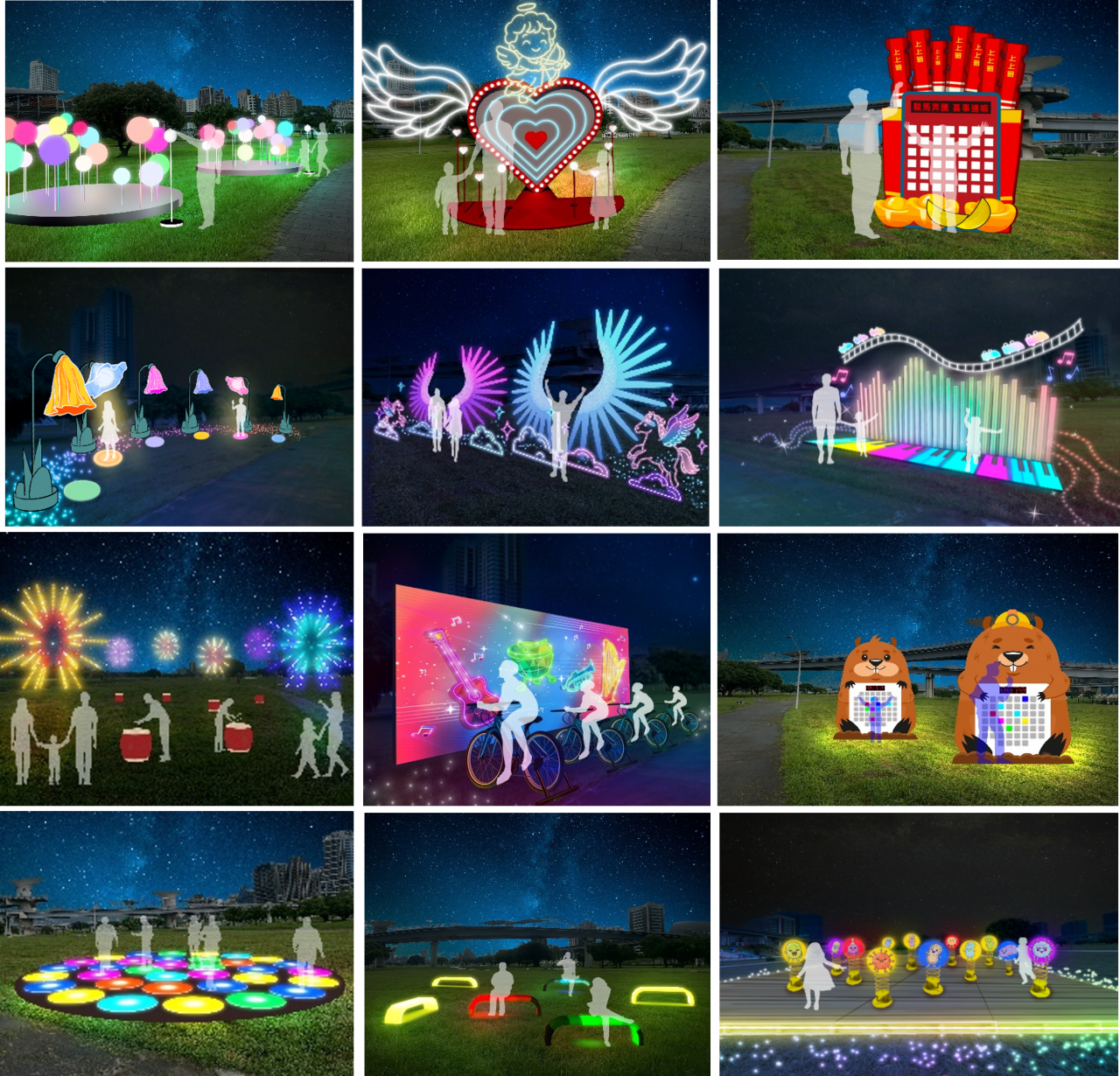 12組互動燈組化作童話繪本裡的「奇幻篇章」,串聯12組互動燈組,將光影、音樂與肢體互動巧妙融合,提供「親子互動」的歡樂天地。
