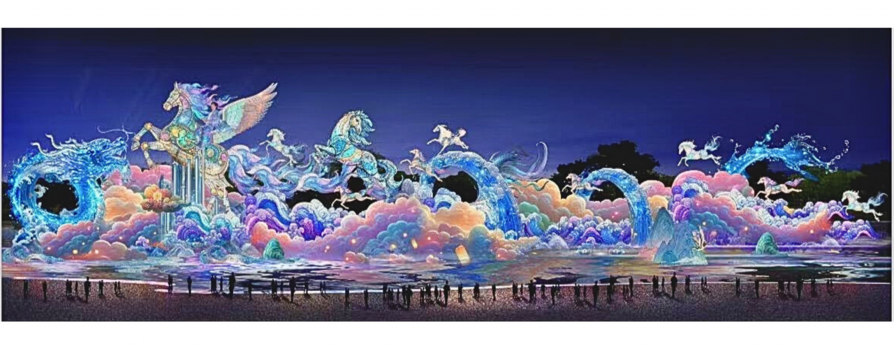場景設計以蜿蜒草地燈條勾勒出星河軌跡,彷彿飛馬奔馳時留下的光影足跡,引領觀眾穿梭其中,體驗與飛馬一同漫遊銀河的奇幻旅程,周圍星球燈飾內建互動感應裝置,觀眾輕拍即可觸發燈光明滅與色彩變化,營造出沉浸式的奇幻體驗。