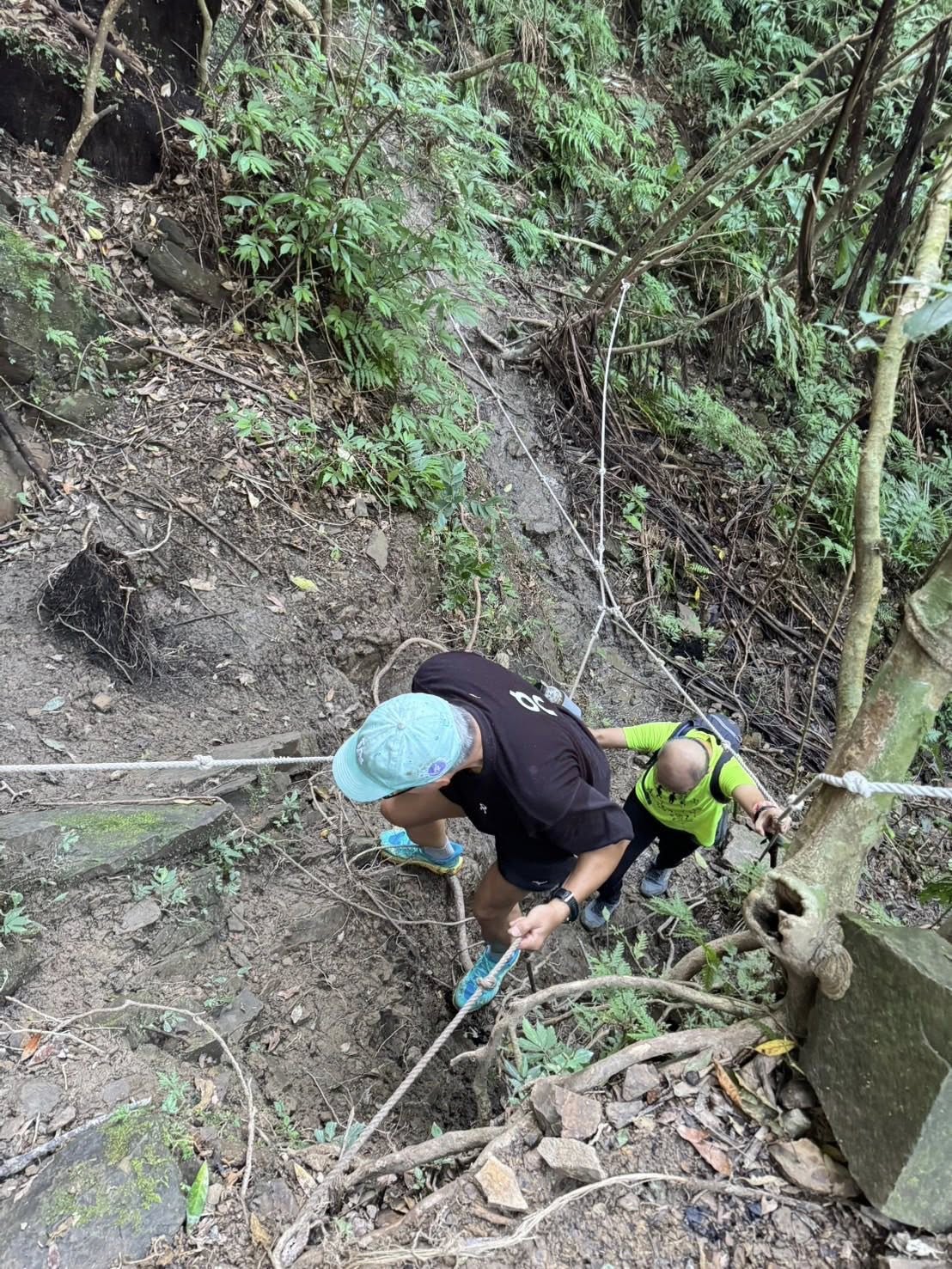 我們經過一處覆蓋蔓草的山徑,慢慢地發現路徑漸漸開闊,原來是阿斌看到山通大海,聯合艦隊的莫利先生帶著他的團隊剛剛劈出來的新路徑,沿途綁著剛綁好的繩子,這是一條麈封很多年,被莫利先生等人劈出來的新路徑。