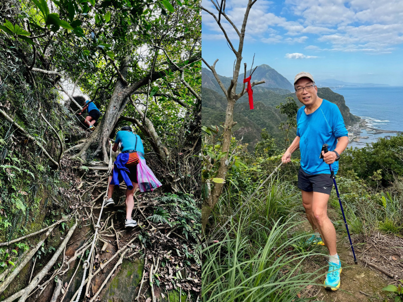 一開始我們就感受到這條山徑的威力!因為從開始就拉繩子在岩壁上陡升200米,這是在濱海公路旁的山,爬上來居高遠眺,立即感受到山海美景的撞擊。我們在140峰停下腳步,看看腳下的海,再往上是柱狀岩,觀景岩,210峰,224大斜岩,尖峰岩頂,長宏岩⋯⋯正印證了峰峰相連到天邊的意境。