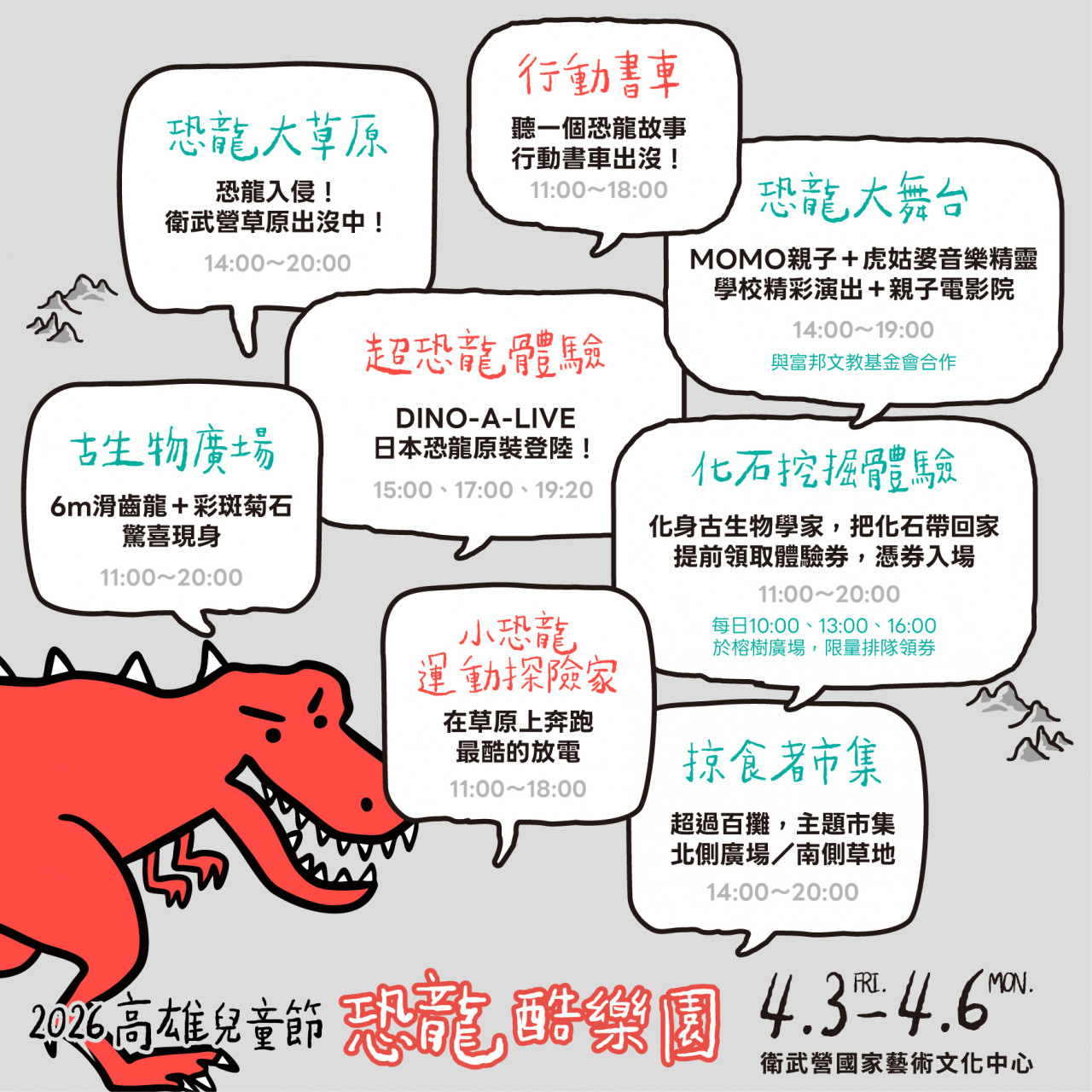 2026高雄兒童節以「恐龍酷樂園」為主題,於4月3日到4月6日在衛武營國家藝術文化中心登場。