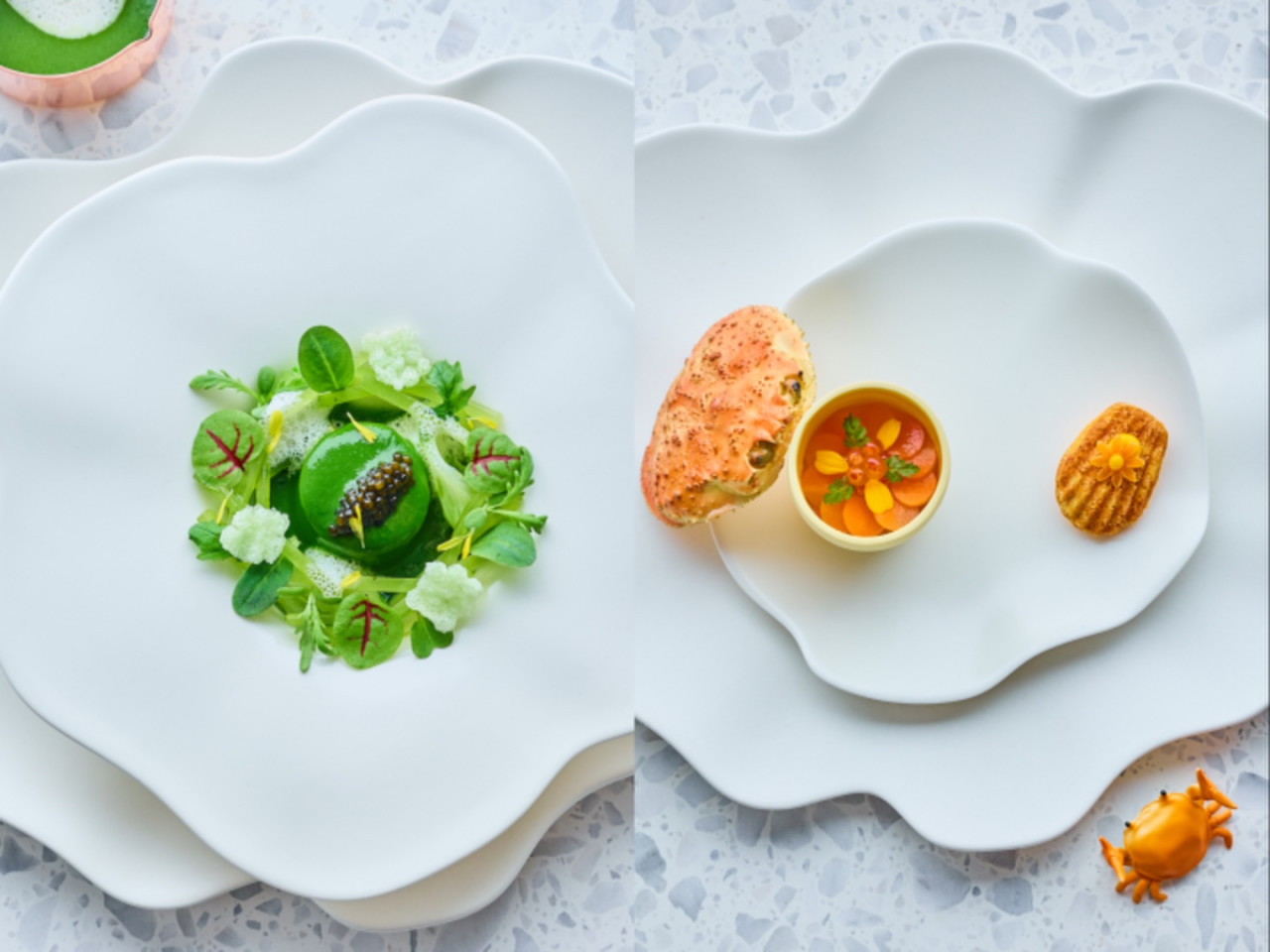 ▲Fricasse「艷綠」春蔬菊燴雞(左)、Amuse Bouche「鮮橘」班尼迪克蛋(右)。(圖片提供:A餐廳)