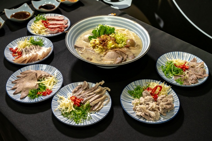 「古早切仔麵」心初意衷套餐,以黑豬嘴邊肉、肝連肉、三層肉、紅燒肉、粉肝與五花肉組成,搭配一碗招牌切仔麵(湯),層層堆疊經典風味;而靈魂醬料承襲母親手藝,不僅提味,更承載對家常味的深刻記憶。