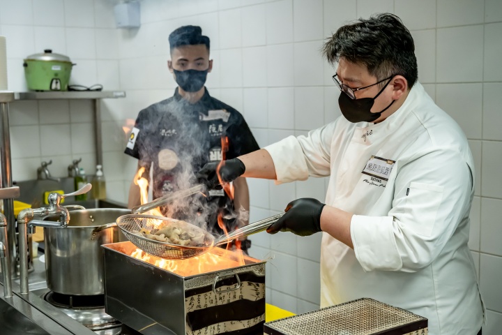 「八里福朋喜來登酒店禧粵樓-中餐廳」主廚黃正豪端出「黑白及第嘟嘟煲」,將八種黑白切食材分別處理後以秘製醬汁高溫爆炒,粵式煲仔料理滋滋作響的聲音與濃郁焦香,打破黑白切以冷切或汆燙為主的印象。