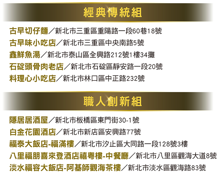 經典傳統組拼的是對食材原味的極致追求與傳承。去年冠軍「古早切仔麵」再次蟬聯冠軍寶座!老闆王家豐以傳承自母親的手藝,帶來陣容升級的「心初意衷套餐」,新增將溫體去皮五花黑豬肉以高湯汆燙的吃法,咀嚼間慢慢釋放鮮甜。特製的桂花醋適合沾滑嫩粉肝、蒜蓉柴燒醬為五花肉添賦燻香,讓風味更顯豐富。