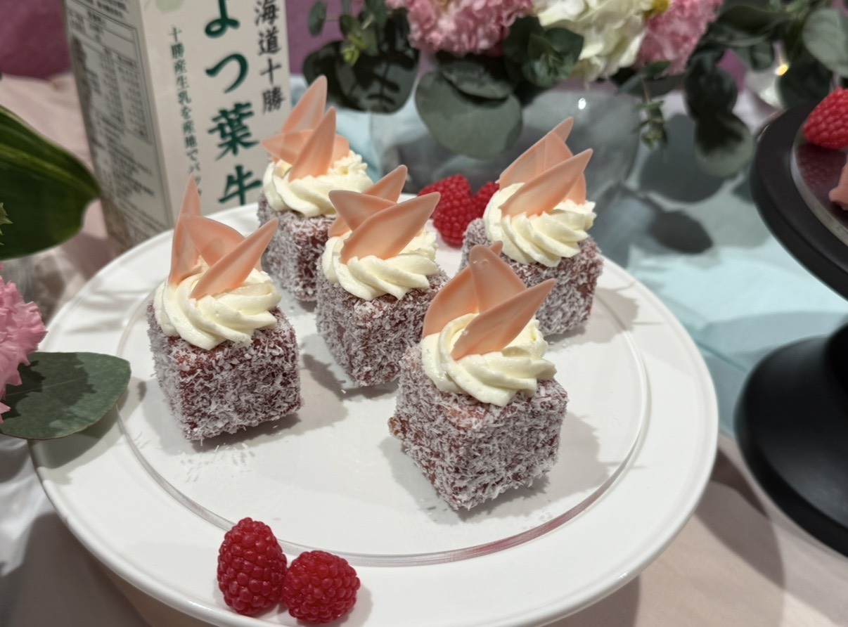 5. 外型粉色的「寶盒」(椰雪覆盆莓蛋糕),以「四葉乳業」奶霜製成細緻的蛋糕體,裹上覆盆莓果泥與椰子絲,再點綴牛奶香緹,整體酸甜清新,宛如春日的點滴珍藏於寶盒。