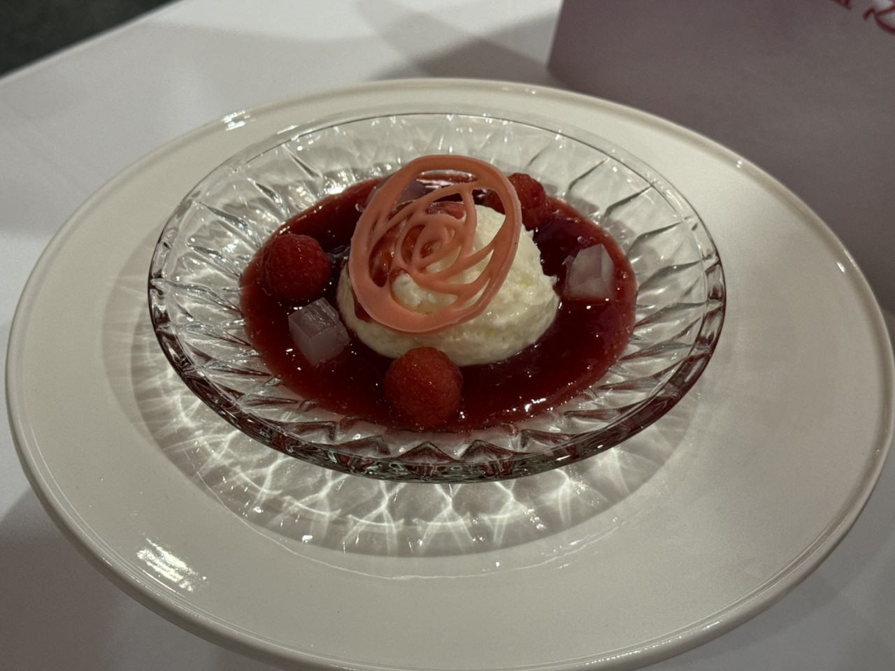 2.全餐期供應的「羽瞬」(綿雲莓果塔)。說到春天,最有代表的就是櫻花;櫻花的花季很短暫,盛開的花朵能讓人牢記,用草莓的果泥做出入口即化的口感,如同稍縱即逝的花季。