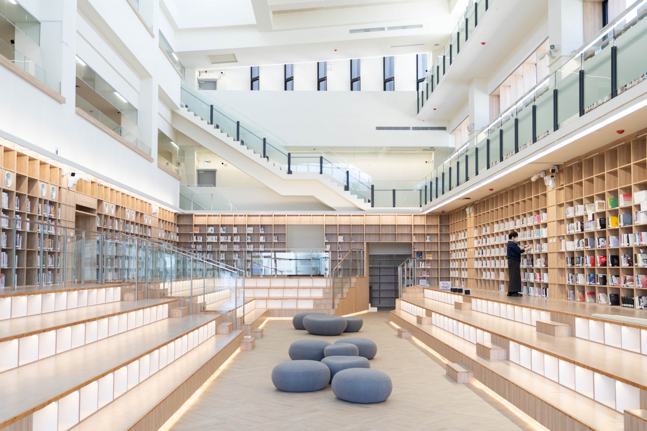 館內採全齡共享設計,大面書牆與階梯式閱讀空間,提供民眾舒適多元的閱讀與學習環境