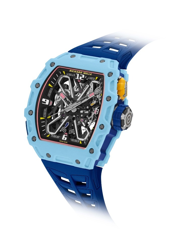 兩款全新RM - Rafael Nadal⾃動上鍊腕錶延續了此⾼性能腕錶系列的突破性功能:獲得專利的蝶形擺陀。這項獨特的機制讓佩戴者可以透過兩種不同的模式掌控上鍊過程:⽇常佩戴的常規模式,以及在激烈運動時防⽌過度上鍊的運動模式。 此錶款兼具趣味性和精湛技藝在劇烈運動時保護機芯,同時⼜保留了⾃動上鍊腕錶的實⽤性。RM -及由五級鈦合⾦製成的RMAL機芯,憑藉蝶形擺陀,讓佩戴者能夠直接控制上鍊效率。 在充滿活⼒的夏⽇⾊調之下,RM -依然彰顯著品牌不斷創新的動⼒以更⼤膽的⽅式重新詮釋既有系列作品,融合其精湛⼯藝與美學創新的獨特魅⼒。