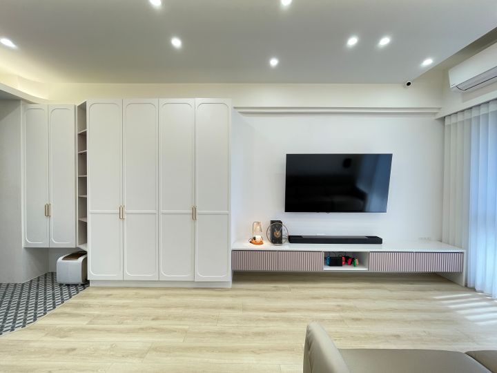 全屋收納設計充分考量空間活用性,天花板層次的光源設計,讓整體燈光更柔和而不刺眼,完美地弱化了小空間的壓迫感。業主特別滿意客廳的設計,成為全家人共享時光的最愛場域,讓生活中的每一天都能在這個小宇宙中綻放光芒。