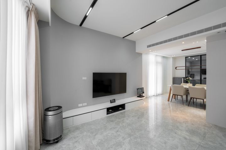 客廳部分採用一字型沙發,保留更多活動空間給孩子,並捨去大型茶几,讓小朋友能自在玩樂。餐椅則挑選寬敞設計,兼具實用性與穩重感。牆面以不同明度的灰色層次堆疊,透過磁鐵吸附的軌道燈與智慧燈光系統,營造出溫暖且多變的光影氛圍,讓灰、黑、白三色主調更顯豐富層次。