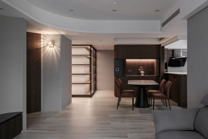 全案貫穿著「為家人留一盞燈」的設計初心。玄關處的壁燈,不僅點亮回家的路徑,更傳遞出「守護」與「迎接」的寓意。電器櫃則採用防塵設計折門,有效隱藏飲水機與咖啡機,兼具美感與實用性,也讓整體的櫃體視覺更延伸。而玄關處的明暗層次的搭配,呈現了「晨暮之間,光影流轉」的設計變化,以「一迴廊、一盞燈、一份實在的溫暖」,細細記錄了家庭成員每一天的美好記憶。
