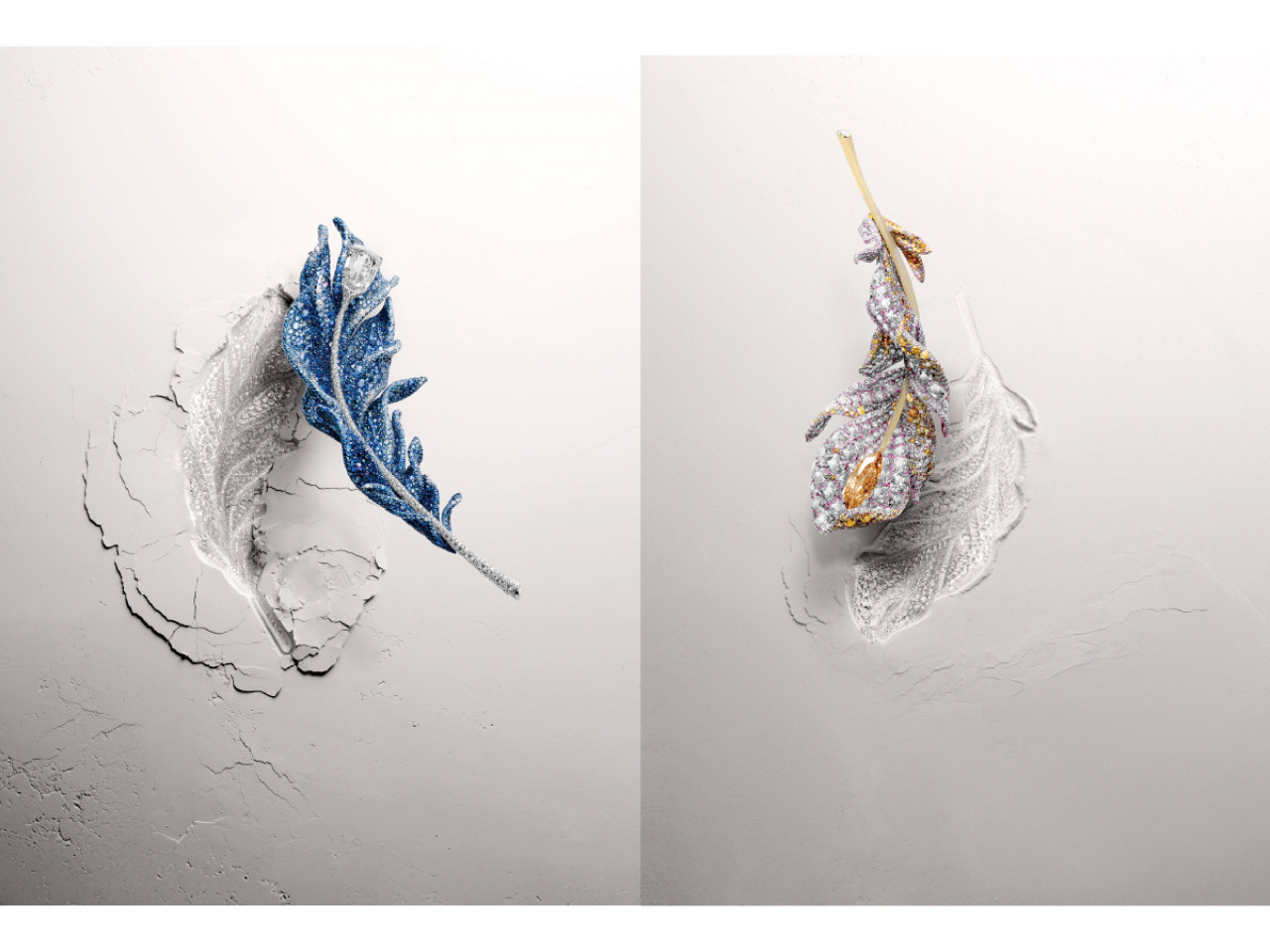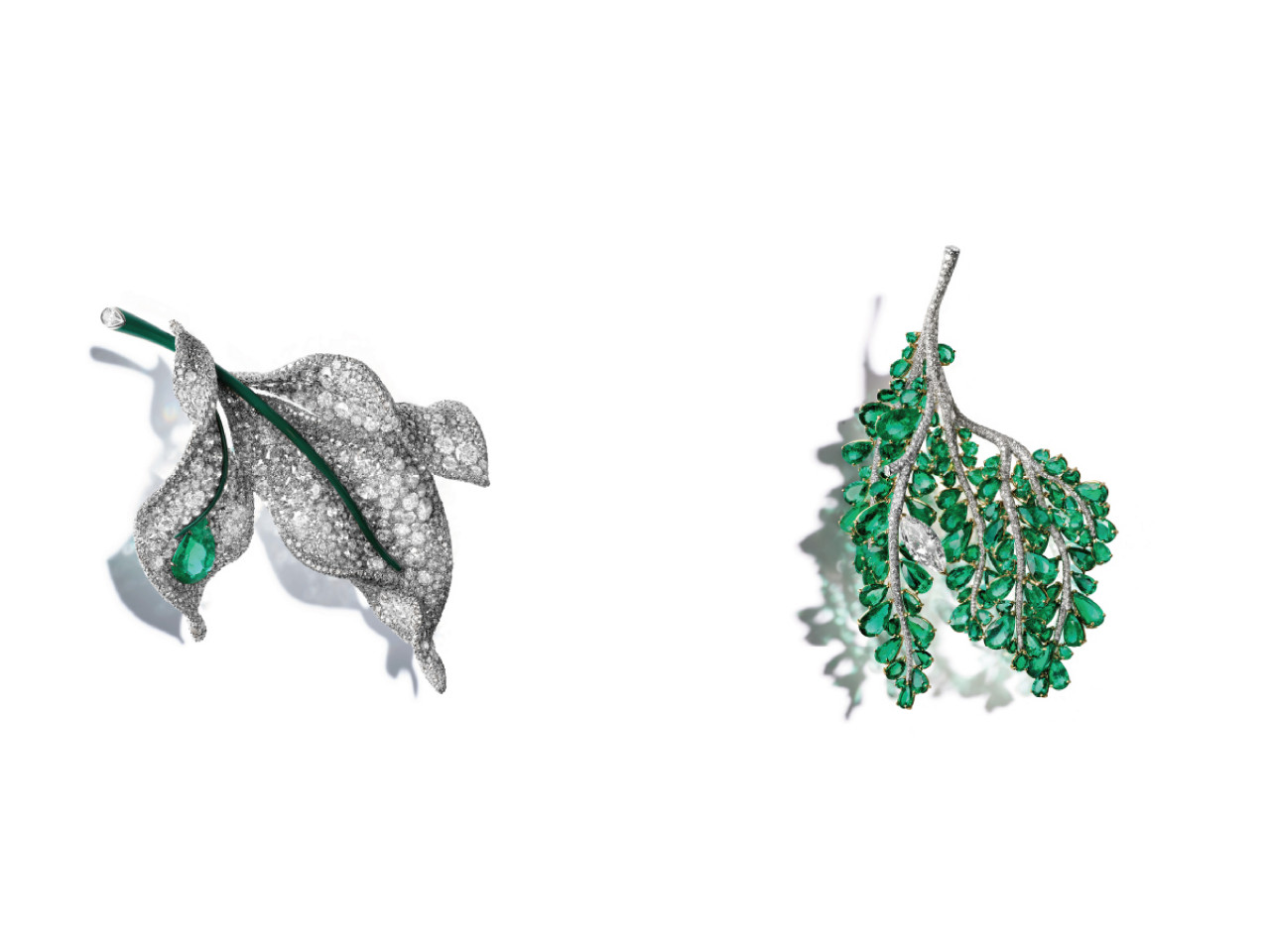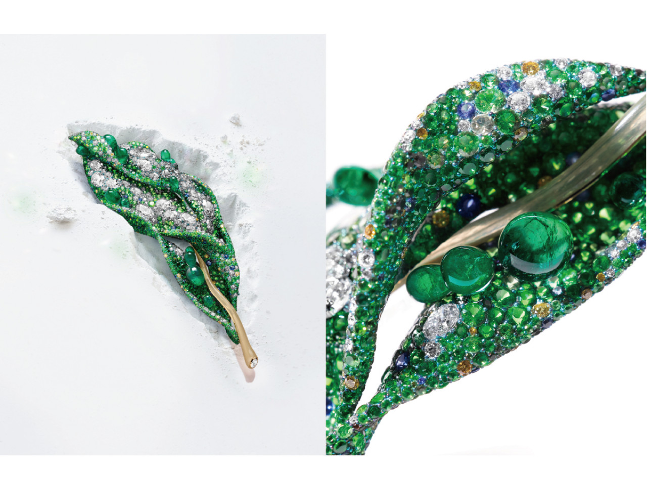 全新的〈樹枝胸針〉在用色上更加大膽,以全新色調搭配娓娓訴說季節脈動。白鑽與祖母綠細膩鋪陳,交錯成春芽萌動的節奏,另一款則選用白鑽搭配黃鑽,令人聯想到秋日金黃的豐收意象。流暢的枝幹線條弧度自然舒展,首次採用了 HyCeram 陶瓷漆,以手工多層塗覆與拋光,呈現近乎鏡面的光澤與極高色穩定度;〈楓葉胸針〉則以光影捕捉秋的詩意,多層次三葉結構呈不規則翻轉,唯妙唯肖的復刻出微風掠過時楓葉搖晃的細膩姿態,每一條葉脈均以顯微蠟雕塑形,再以細密鑲嵌技法重現楓葉葉緣的「鋸齒」結構,將寶石由深至淺的排列鑲嵌,完美重現光影由暖調至冷調的豐富色彩變化,將時間定格於最生動的一刻。