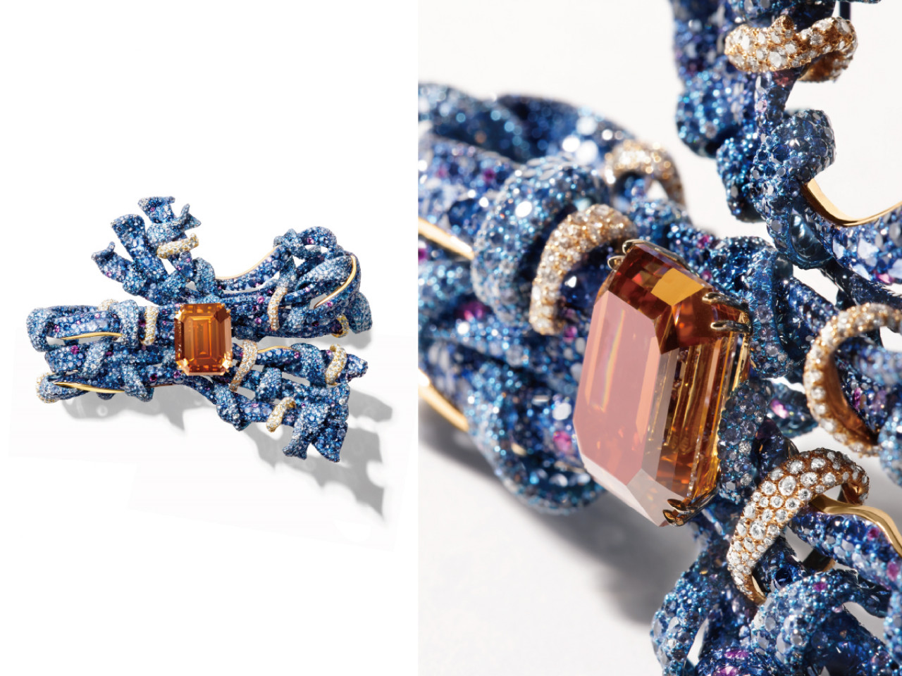 而在〈編織胸針〉中,這份對生命律動的觀照被轉化為另一種語言──建築性的秩序與詩意的自由。胸針的創作靈感來自高級訂製服常見的軟呢織物結構,為讓堅硬的金屬最大程度呈現出如同「編織」般的特殊質感,CINDY CHAO開創全新結構技術,將近百個獨立組件重新嵌合,46條鈦金屬細緻絲帶橫豎交織,經蠟雕、塑形、陽極上色,再一條條以顯微精度鑲嵌寶石;與周圍近7,000顆寶石構築出超過 21 種色階的光譜漸層,讓冰冷的金屬呈現近乎布料的柔韌感,完美復刻出編織後的特殊紋理,中央主石為25克拉祖母綠橘棕色鑽石,與藍紫色調的胸針形成強烈對比,9個黃金鋪鑲裝飾元素與5條黃金線則以多重技法嵌入胸針中,正是「以最堅硬的材質,完成最柔軟的線條」的極致實踐。