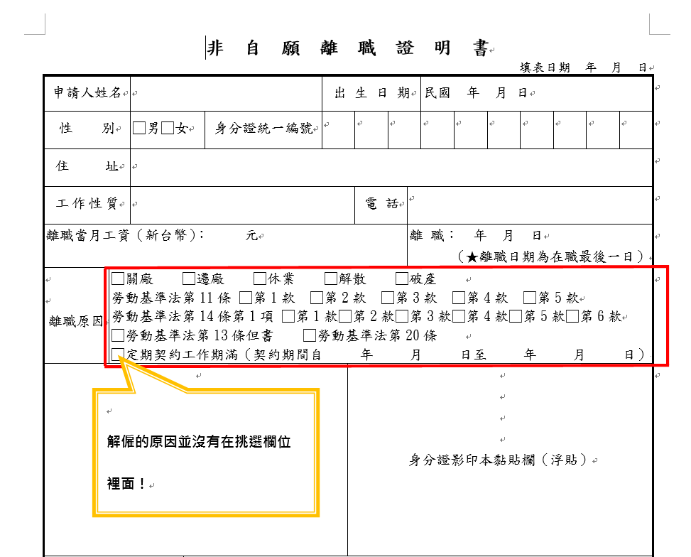 其實每一間企業都有自己的表單,但我強烈建議如果可以用政府單位的表單,最好是用,因為出錯的機率真的會非常的低,我也請這位老闆娘看一下這一張表單,請問離職原因的欄位有任何勞基法第12條解僱的條款嗎?如果沒有的話,就代表解作只能取得『服務證明』,而不是『非自願離職證明』,因此一個解讀上的錯誤,因而造成此案的勞資爭議。