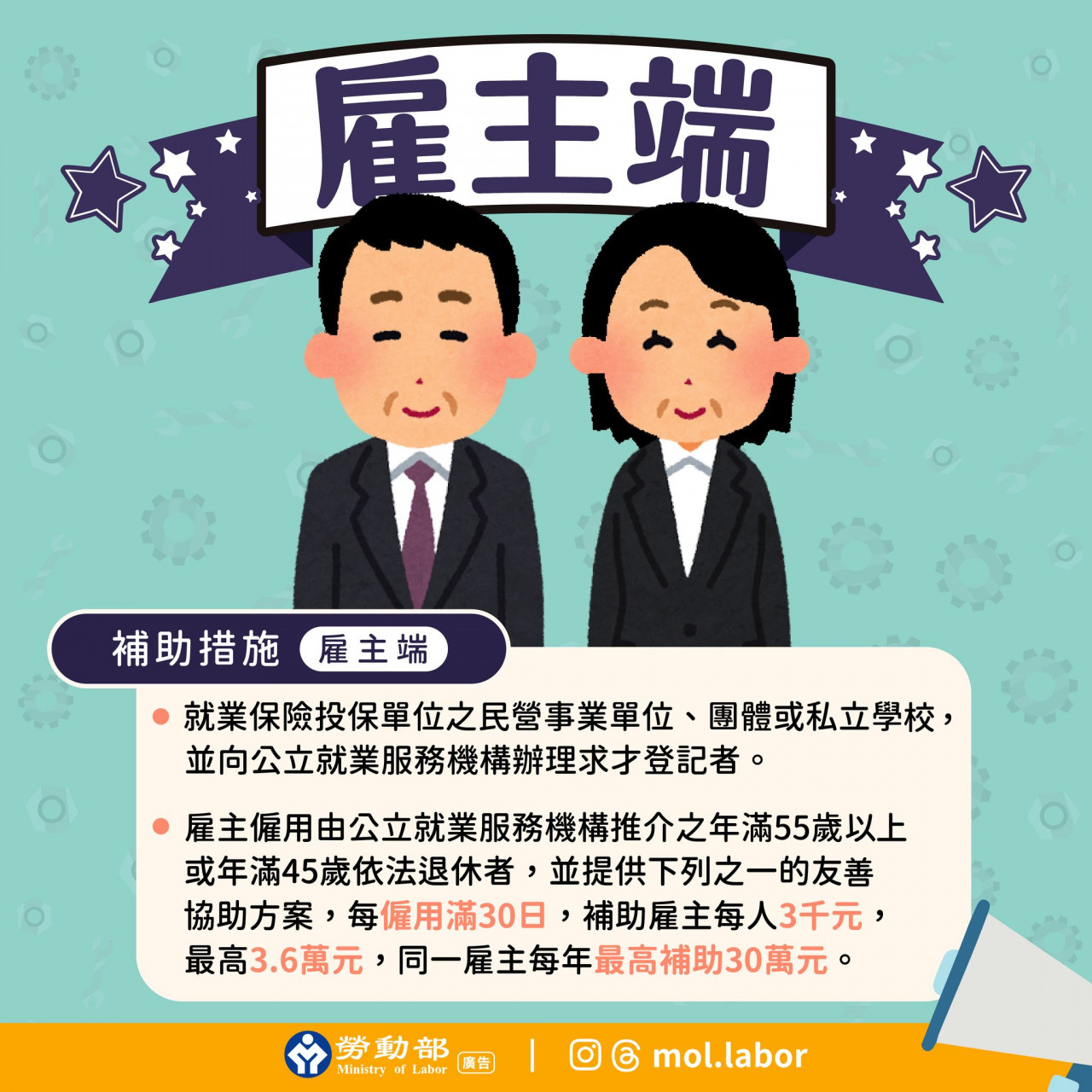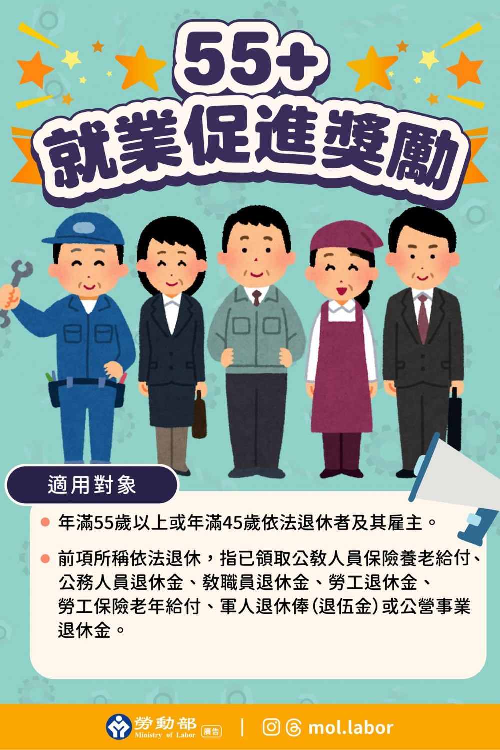 為改善就業環境,勞動部推出「55Plus就業獎勵」,增進壯世代重返職場及再就業意願。符合條件且為全職工作的中高齡者,最高可領取6萬元就業獎勵金,雇主若僱用符合條件的中高齡朋友並提供友善措施,一年最高可領取30萬元補助。