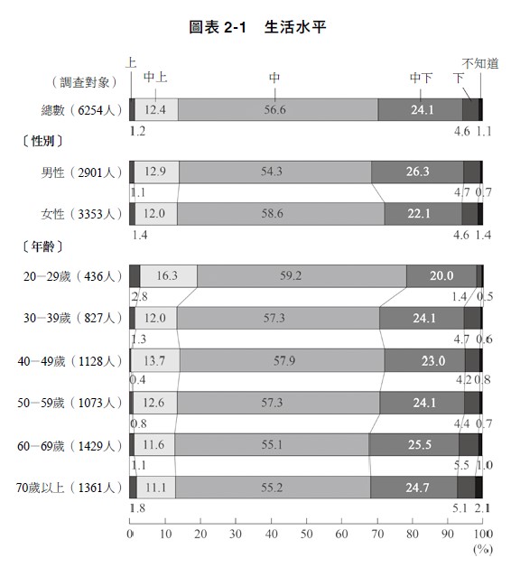 出處:2014 年度《關於國民生活的輿論調查》(「按社會普遍標準來說,您的生活水平如何?」)