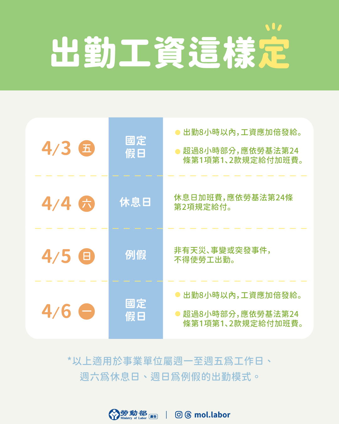 4月3日(兒童節補假)、4月6日(清明節補假)性質為國定假日,依照《勞動基準法》第39條規定,「雇主經徵得勞工同意於休假日工作者,工資應加倍發給。」