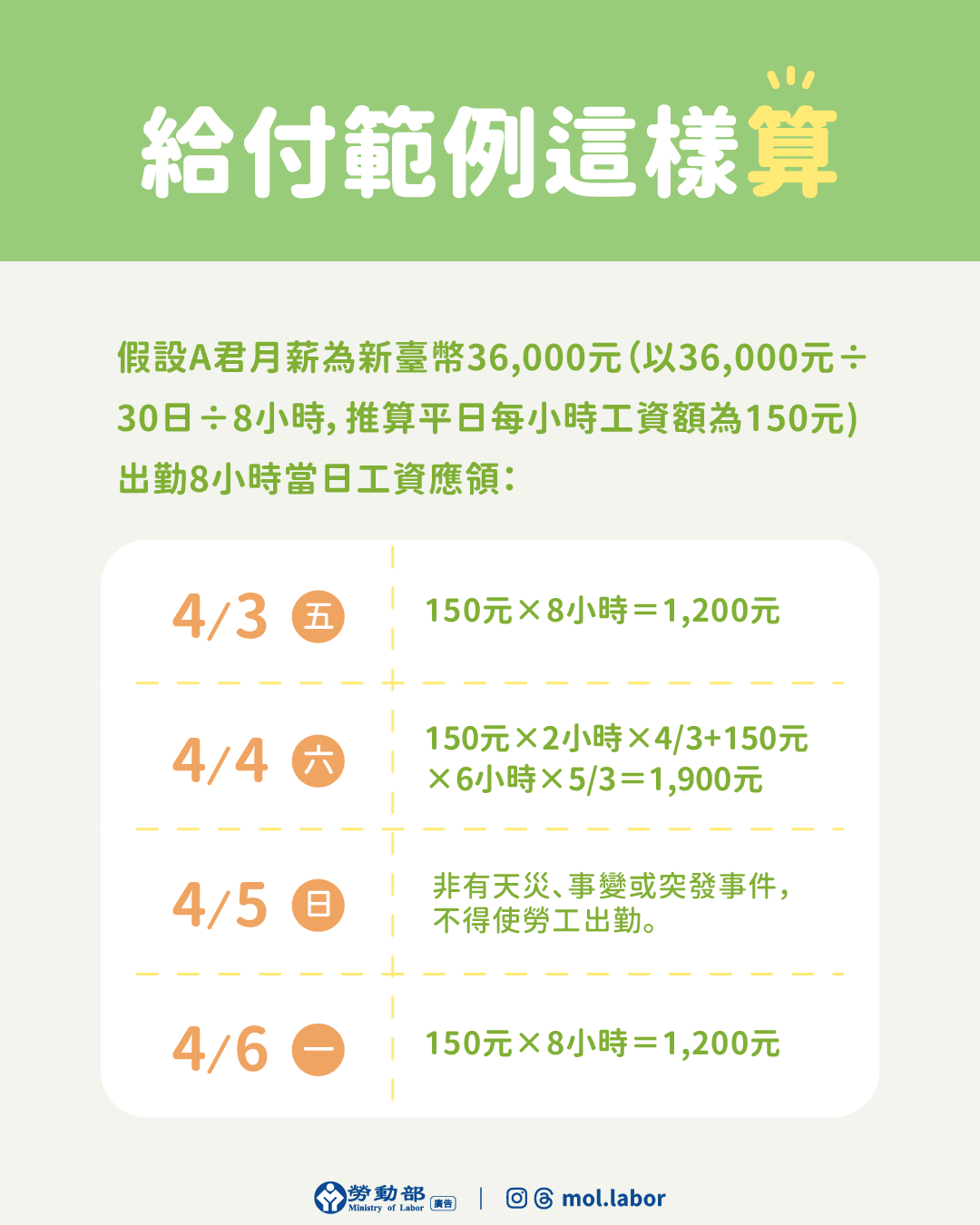 | 4月4日(六) | 休息日 | 出勤應獲得加班費 |