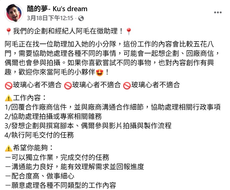 YT頻道「酷的夢」徵助理,「玻璃心不適合」引網友熱議