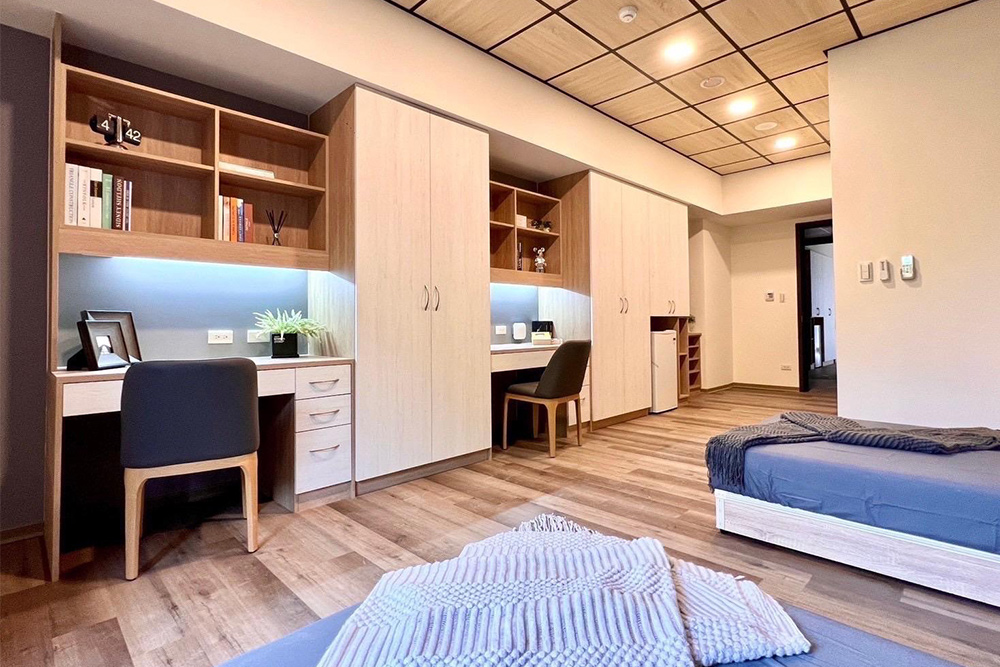 不管是床邊燈的設計,還是木質調的簡約風格,都令網友們大讚超有質感「好像住進青旅」!就連走廊和公共區域也都走大器的簡約風格,也難怪讓不少網友們盛讚是「最豪華宿舍」。