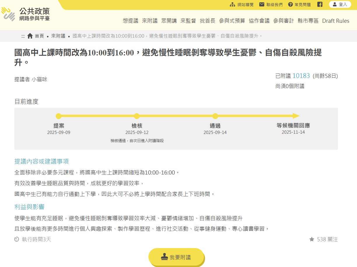 近日有民眾於「公共政策網路參與平台」進行提案,認為應將「國高中上課時間改為10:00到16:00,避免慢性睡眠剝奪導致學生憂鬱、自傷自殺風險提升」。提案人主張移除非必要的多元課程,將國高中生上課時間縮短為10:00至16:00,讓學生能夠有更充足的睡眠時間,避免慢性睡眠剝奪導致學習效率大減、憂鬱情緒增加、自傷自殺風險提升,也能利用課餘時間進行個人興趣探索。