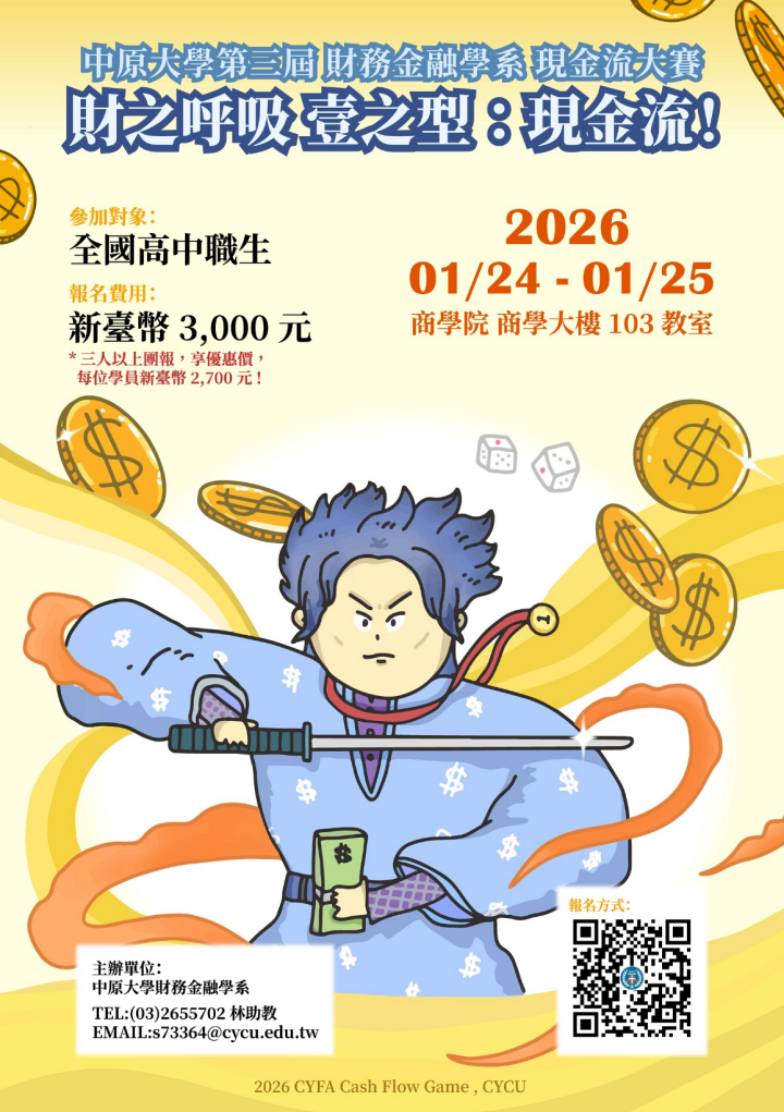 中原大學財務金融學系即將舉辦第三屆「現金流大賽」,以趣味主題「財之呼吸 壹之型:現金流!」吸引全台高中職生組隊參賽。活動以遊戲化方式導入財務與投資觀念,透過模擬真實市場情境,協助學生在體驗中學習財金專業,深化財務素養。
