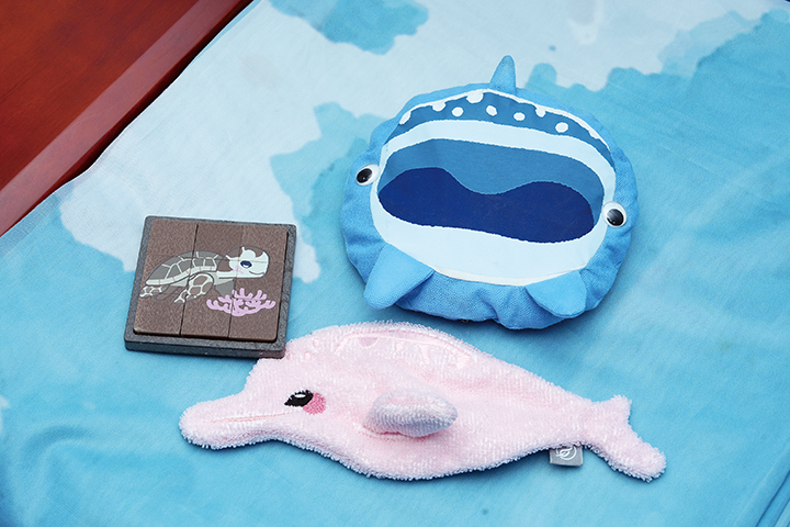 海廢再生聯盟成員運用海廢再生料搭配海保署明星海洋物種製作三款海廢高值化產品。