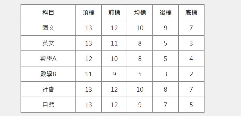 | 考科 | 頂標 | 前標 | 均標 | 後標 | 底標 |