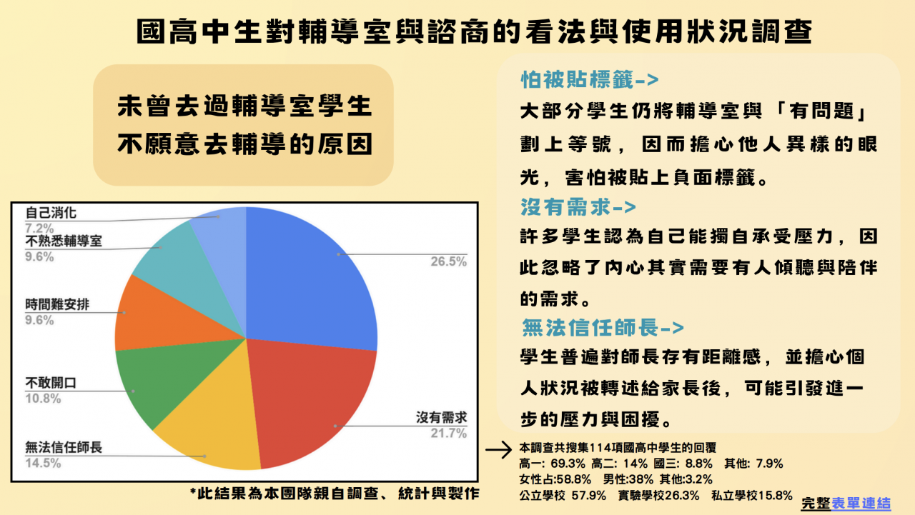 「我們透過表單、實際訪談與調查,觀察大家對輔導室的真實看法。」賴姵澐,雖然最後沒有被抽中上台向總統簡報,但在產出提案的過程中,同學們搜集大量現有產業資料,並且搭配自行設計的調查,讓成員們對於這個議題的了解也更深入。