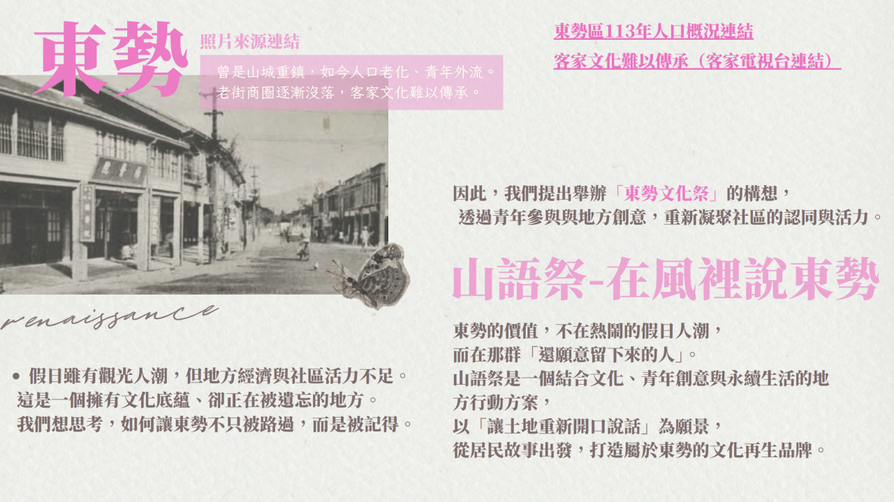提案學生以文字受訪指出,之所以選擇「復興東勢老街」作為題案,源自於小組成員對故鄉與地方記憶的共同關注。在討論過程中,許多曾在歷史中閃耀的地方文化,正隨著時代更迭被城市發展掩蓋。因此,希望透過「山語祭」,重新呈現東勢的故事與情感,讓東勢再次被看見,使文化得以延續。