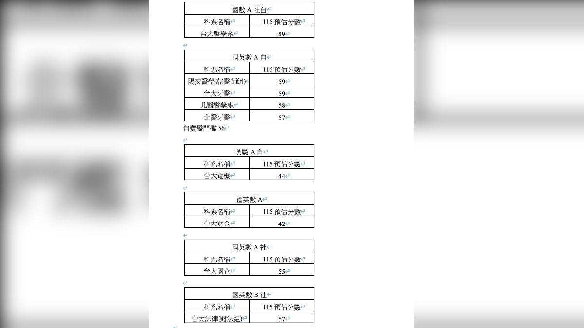 115學年度學科能力測驗成績周三(2/25)上午公布,得勝者文教也分析,今年落點可直接參考113、114分數,其中台大醫學系、陽交醫學系(醫師組)、台大牙醫預估要59分,而北醫醫學系得分預估要58、北醫牙醫估57分。