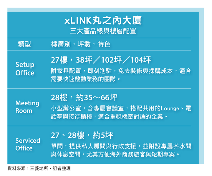 xLINK 順應這股潮流,並以日式精準管理建立差異化優勢,比如品牌一致、空間品質穩定、服務細緻,確保即便是小型辦公室,也能呈現專業形象與高信賴度。所以自二〇二二年成立靈活辦公空間部門以來,三菱地所將產品線拓展至三十五~六十六坪的高坪效單元,特別適合新創與成長型企業,並導入與大型企業總部同等規格的一級物業管理與共享配套,既能應對不斷上漲的建築成本,也符合永續發展趨勢。