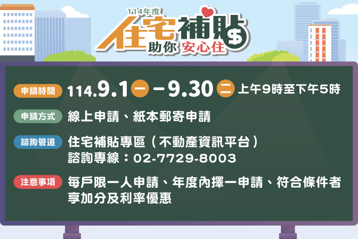 114年住宅補貼申請 自9月1日上午9時起至9月30日下午5時止 開放受理,民眾可線上或郵寄申請。住宅補貼每年限申請一次,同一家庭僅能一人提出,補貼採評點排序,符合條件者可享有加分與利率優惠。