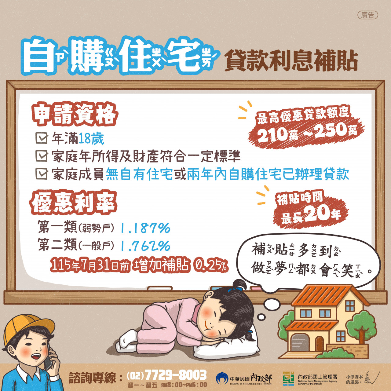 為落實政府對於居住正義的承諾,協助人民居住於適居住宅,內政部國土管理署推出「自購與修繕住宅貸款利息補貼」,優先照顧經濟及社會弱勢族群,提供較低的貸款優惠利率,期待真正減輕民眾因住宅貸款利息產生的負擔與壓力。