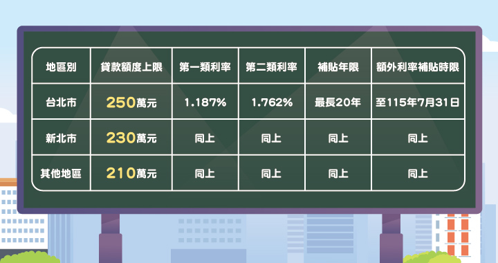 ◎關於補貼內容及優惠:貸款額度上限為台北市250萬元、新北市230萬元、其餘縣市210萬元。