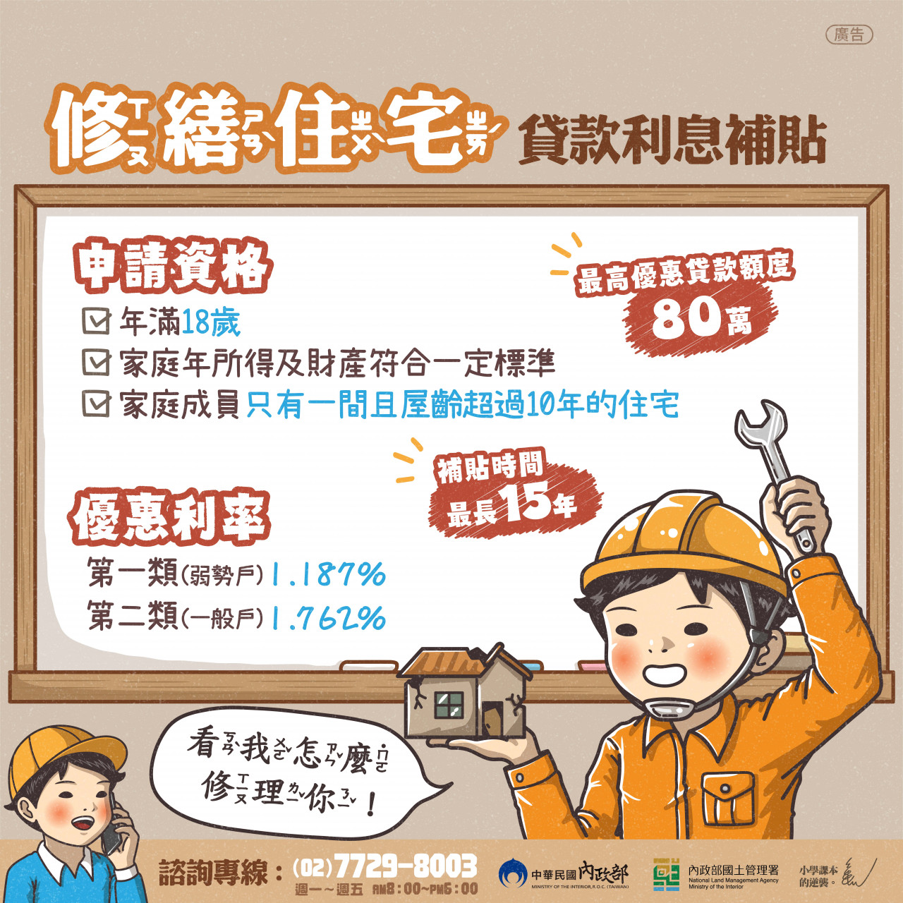 為落實政府對於居住正義的承諾,協助人民居住於適居住宅,內政部國土管理署推出「自購與修繕住宅貸款利息補貼」,優先照顧經濟及社會弱勢族群,提供較低的貸款優惠利率,期待真正減輕民眾因住宅貸款利息產生的負擔與壓力。