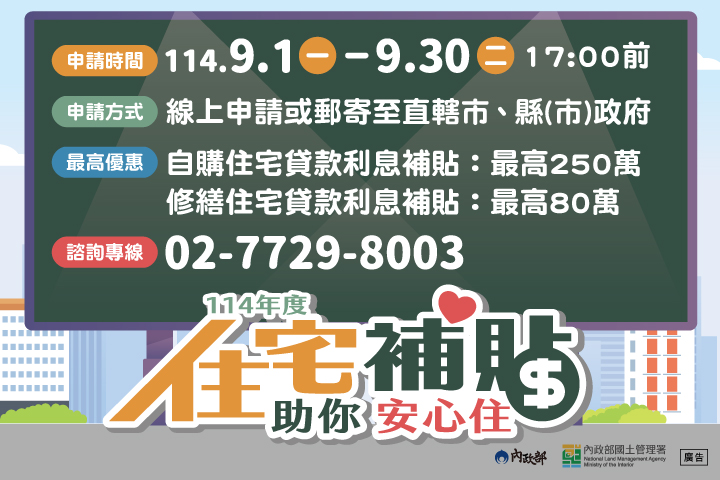 自購與修繕住宅貸款利息補貼申請期間為114年9月1日上午9時至9月30日下午5時止,民眾可選擇線上申請或郵寄申請;申請案件將由戶籍所在地的直轄市、縣(市)政府受理並進行審查。