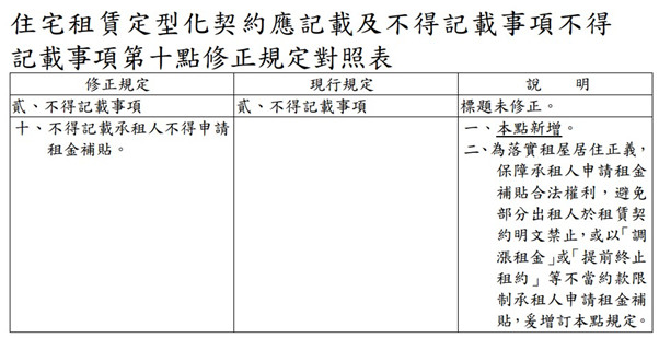 ▲住宅租賃定型化契約應記載及不得記載事項不得記載事項第10點修正總說明及對照(圖片來源:內政部網站)